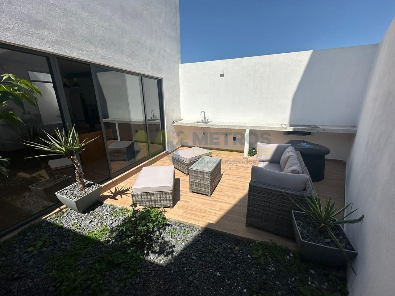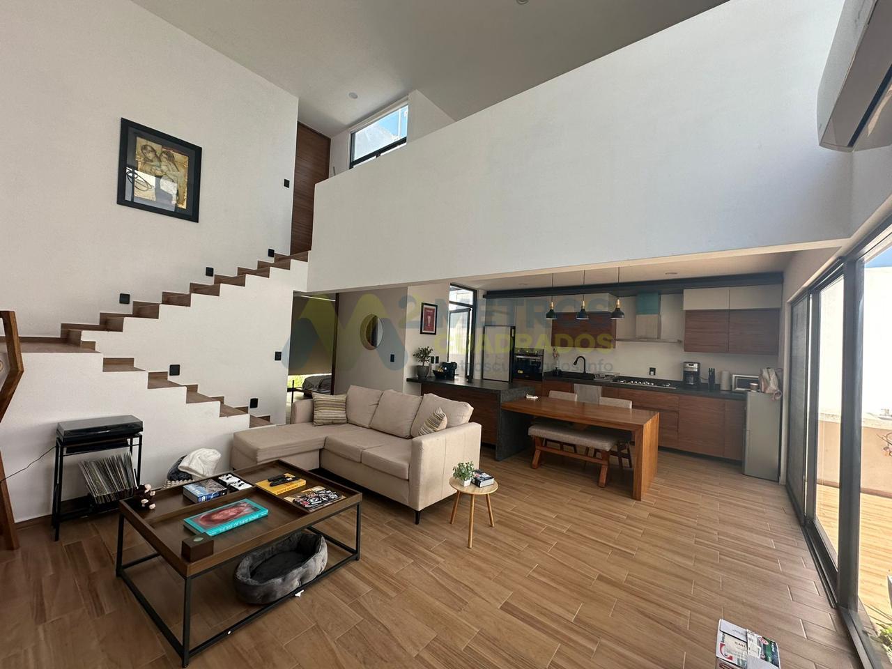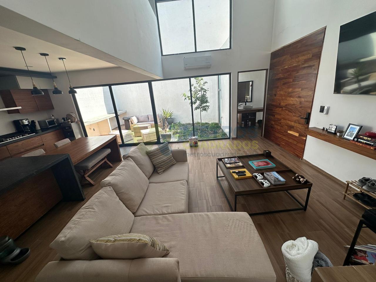 Sala-Comedor a Doble Altura, Cocina Equipada con Refrigerador de Diseño, Habitación con Vestidor y Baño Completo, Medio Baño, Terraza-Jardín con Asadores, Patio de Servicio, Cochera 3 Autos.